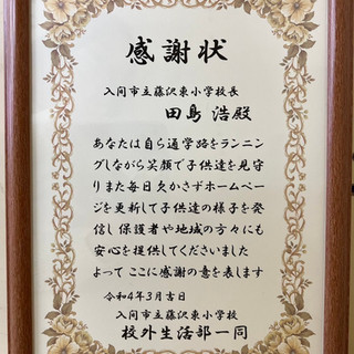 今年度の校外生活部のメンバーで話し合い、毎朝ランニングをして子供達の安全を見守ってくださっている校長先生に感謝状を贈りました。サプライズだったので校長先生はとても驚かれていましたが、喜んでいただけたようで私たちも嬉しかったです。